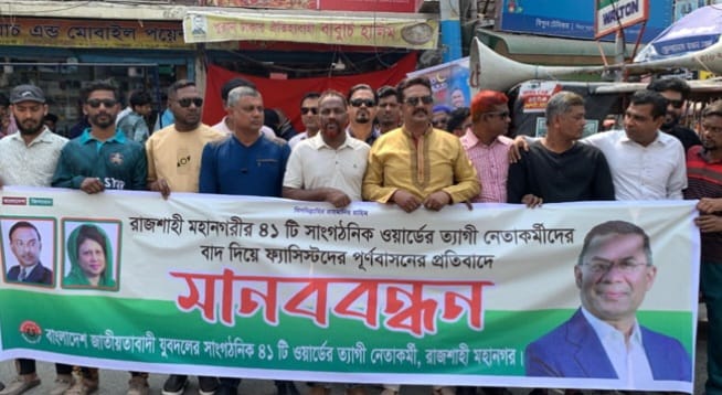 রাজশাহী মহানগর যুবদলের ৪১টি সাংগঠনিক ওয়ার্ডে ত্যাগী নেতাকর্মীদের বাদ দিয়ে ‘ফ্যাসিস্টদের পুনর্বাসন’ -এর অভিযোগ তুলে মানববন্ধন করেছেন বঞ্চিত নেতাকর্মীরা।