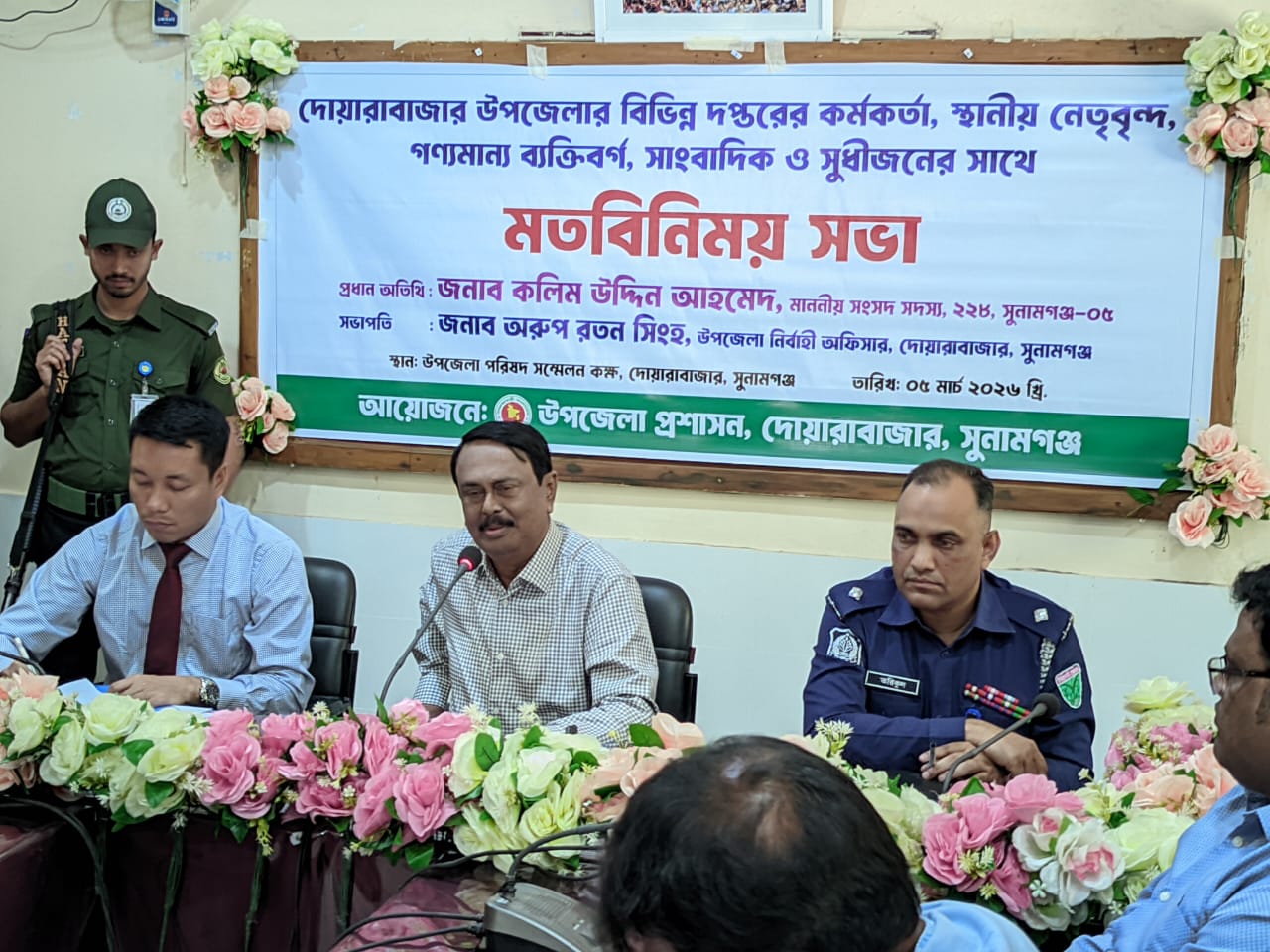 সুনামগঞ্জের দোয়ারাবাজার উপজেলা প্রশাসনের আয়োজনে বিভিন্ন দপ্তরের কর্মকর্তা, রাজনৈতিক নেতৃবৃন্দ, গণ্যমান্য ব্যক্তিবর্গ, সাংবাদিক ও সুধিজনদের সাথে সুনামগঞ্জ- ৫( ছাতক-দোয়ারাবাজার) আসনের নবনির্বাচিত সংসদ সদস্য ও বিএনপির কেন্দ্রীয় নির্বাহী কমিটির অন্যতম সদস্য কলিম উদ্দিন আহমদ মিলনের সঙ্গে মতবিনিময় সভা অনুষ্ঠিত হয়েছে।